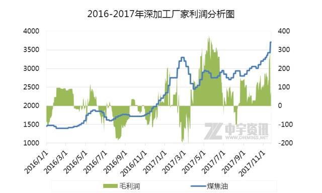 首先,我们不妨与2016年市场做个比较,从图中可以很明显看到,整个2017年价格均凌驾于2016年之上,犹记得2016年9月中旬国内煤焦油市场也开启一波长达5个月之久的上行态势,一直持续到17年2月,中宇资讯统计数据显示,华东地区价格从1720元/吨上涨至3300元/吨,上涨1580元/吨,涨幅达到91.86%,而今年9月市场开启的上行态势至11月底也已经自2800元/吨上调至4000元/吨,上涨1200元/吨,涨幅达到42.86%,并且涨势仍在延续,那如此之大的涨幅下,下游厂家盈利空间又如何呢?