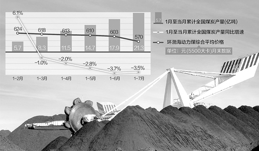 中国煤炭工业协会19日通报,今年前7个月全国煤炭产、运、销均出现下降。前7个月全国煤炭产量21.3亿吨,同比减少7800万吨,下降3.5%;全国煤炭销量20.7亿吨,同比减少8400万吨,下降3.9%。前7个月,全国铁路发送煤炭13.22亿吨,同比减少1629万吨,下降1.2%。