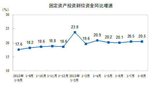 2013年1-8月份,全国固定资产投资(不含农户)262578亿元,同比名义增长20.3%,增速比1-7月份加快0.2个百分点。从环比看,8月份固定资产投资(不含农户)增长1.61%。