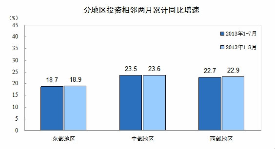 分地区看,1-8月份,东部地区投资123485亿元,同比增长18.9%,增速比1-7月份加快0.2个百分点;中部地区投资73287亿元,增长23.6%,增速加快0.1个百分点;西部地区投资64313亿元,增长22.9%,增速加快0.2个百分点。