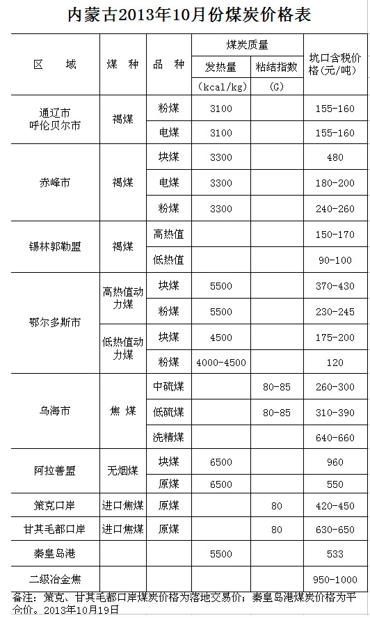 2013年10月份,西部区原煤平均销售价格260元/吨,环比上涨8元/吨,同比下降40元/吨;东部区原煤平均销售价格133元/吨,环比持平、同比下降20元/吨。