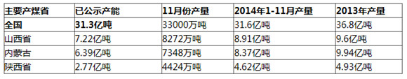 当前,若严格按照产能进行生产,我国煤炭年供应量约38.5亿吨(包括进口煤),据中国煤炭市场网数据,2014年1-11月煤炭消费量约33.7万吨,预计全年约在37亿吨左右,煤炭供需基本平衡。