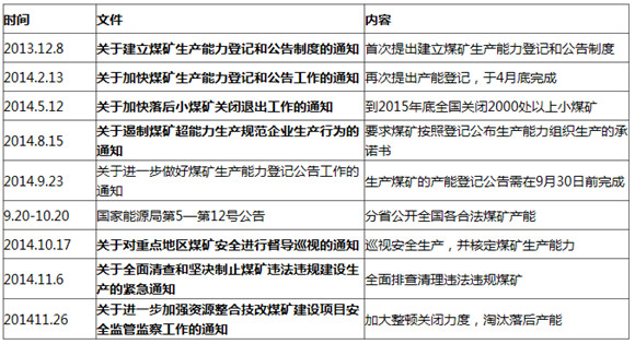 通过上表,我们可以清晰的看出政府以“产能公示”为主的化解产能过剩的政策逻辑。首先公示产能,为限产与治理违法开采打好基础;其次是落实按公示产能生产,让超产煤矿也失去超产土壤;其三通过政府监督检查,社会参与监督,以保持政策的后续执行力。其中也包含了逐步淘汰落后产能等基础性政策。
