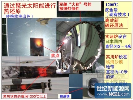 而小滨教授等人解决了这个问题。小滨教授以前一直在开发利用地面效应(飞行在地面附近的飞行器会产生巨大升力的现象)的高速运输系统,但他发现,为实现车身轻量化而使用的阻燃性镁合金可以作为镁燃料电池的负极使用。于是,小滨教授与日本产业技术总合研究所、古河电池公司、日本素材公司等合作,使用这种添加了铝和钙的阻燃性镁合金,开发出了高性能镁燃料电池,而且还提出了通过热还原把用完后变成氢氧化镁的负极再次制成镁的技术方案。这种热还原技术利用的是用凹面反射镜聚集太阳光、从而获得高温的太阳炉。据称,如果能够获得1200℃左右的温度,就能进行热还原。小滨教授等人还实施了使用直径1.5m左右的太阳炉将用过的氢氧化镁以金属镁箔的形式回收的实验。