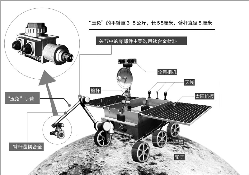 “玉兔”的手臂重3.5公斤,长55厘米,臂杆直径5厘米,形似少年的右手臂。与人的手臂不同的是,它只有肩和腕,没有肘。臂杆是镁合金的,关节中的零部件主要选用钛合金材料。