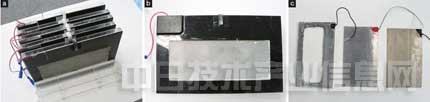 (a)为电池内部。由五个电池单元排列而成。(b)为电池单元。在中间的网状部分与电解液发生反应。(c)电极的阻燃性合金。右为未使用的合金,中间为发生一定程度反应后的合金,左为使用完的合金。发生反应的合金会变成Mg(OH)2溶解到电解液中。
