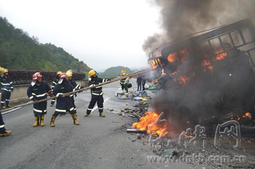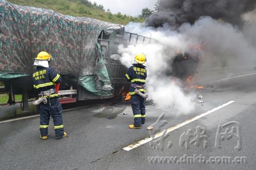 一辆由山西开往漳州的物流货车行驶至厦蓉高速长汀路段246公里处时,突然起火,当时车上载有15吨金属镁(化学物品)。
