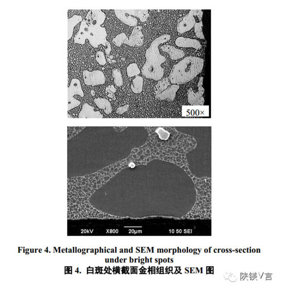 由于先析α相无Al或低Al保护,故在活化阶段发生腐蚀溶解而形成弧状下凹,且膜层生长速度较慢,膜层较薄。先析α晶粒尺寸较大,表面平整,接近镜面反射,成为白斑。而正常的组织由共晶(α + β)组成,易散射,故不能形成白斑。