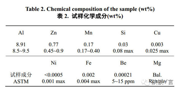 火花原子发射光谱仪测试结果表明,该试样基体成分基本符合ASTM B 93/B 93M-04标准,如表2所示。