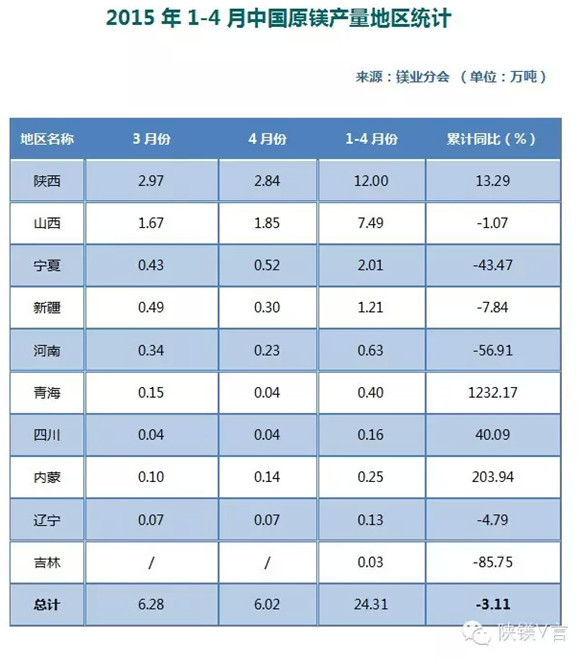 1-4月份我国原镁产量及出口量数据公布。1-4月份,中国原镁产量累计为24.31万吨,同比下降3.11%,这是今年以来第二次出现同比负增长。不过,陕西地区依然保持快速增长态势,前4月累计生产原镁12.00万吨,同比增加13.29%;其他主产区中,山西地区累计生产7.49万吨,同比减少1.07%;宁夏地区累计生产2.01万吨,同比减少43.47%;新疆地区累计生产1.21万吨,同比减少7.84%。