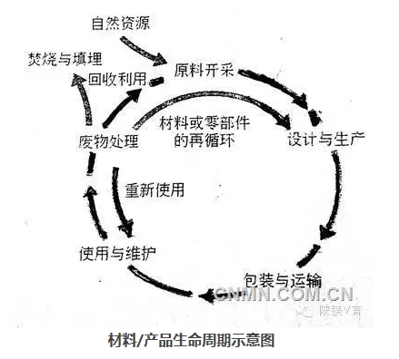 材料的生产、使用、废弃、循环再生与环境之间的关系既相互联系又相互影响与相互制约着,形成一个紧密的极为复杂的系统。因此,应全面系统地看待材料与自然环境的关系,材料与产品生命周期评价是实现这一目标不可缺少的方法,这里说的“产品”一般是指制造业的产品系统,也含服务业提供的服务系统。生命周期是指产品系统中前后衔接的一系列阶段,从原材料的获得或自然资源的生成,直至最终处置,见如下的示意图。