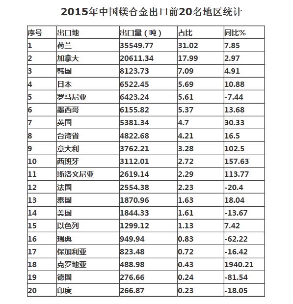其中,荷兰地区出口量35549.77吨,数量占比31.02%,荷兰鹿特丹港为欧洲最大海港,镁出口欧洲市场集散中心。其次为加拿大地区,出口量20611.34吨,占比17.99%。以下为2015年中国镁合金前20名地区出口情况统计: