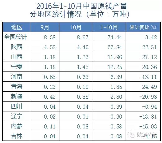 2016年1-10月中国共产原镁74.44万